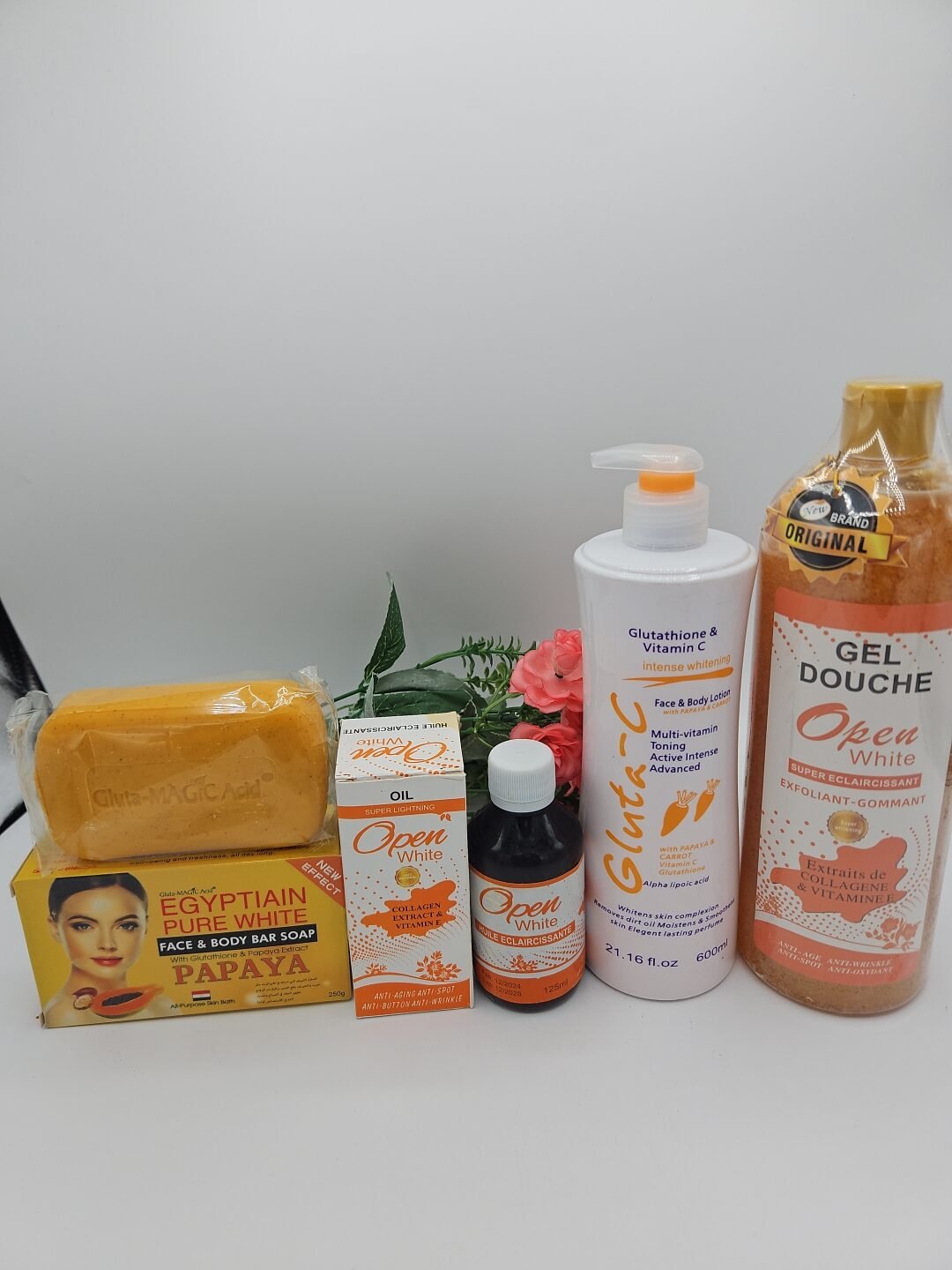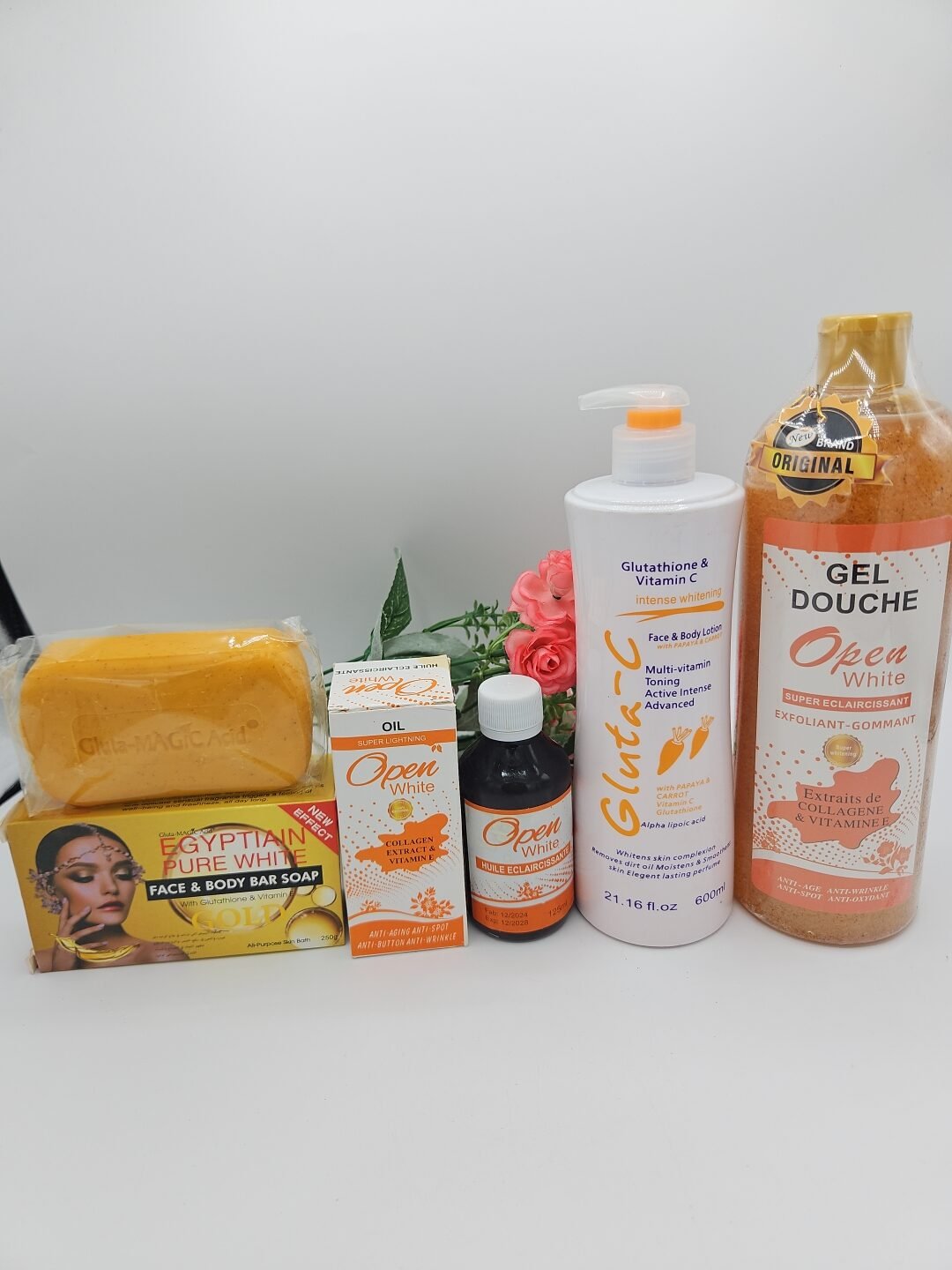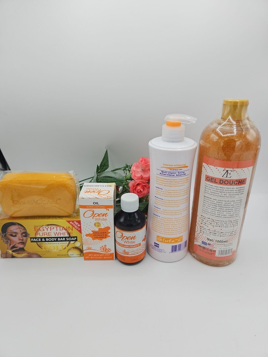 Gamme corporelle Open White gel douche 1litre, huile 125ml , lait corporelle Gluta C 600ml et savon Purec Egyptian Gold 250g