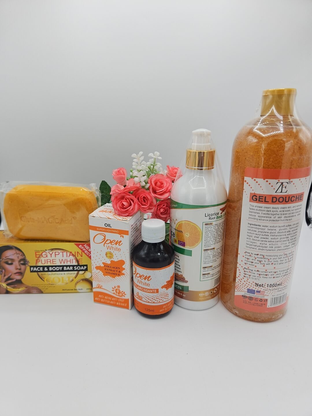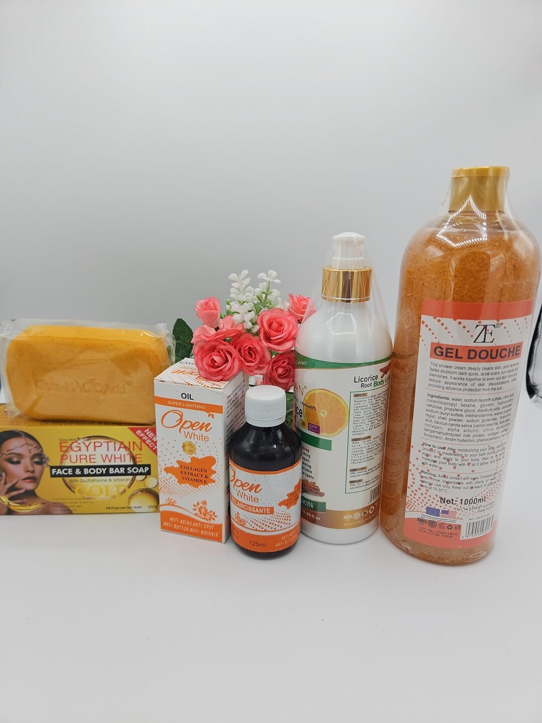 Gamme corporelle Open White gel douche 1litre, huile 125ml , lait corporelle LICORICE ROOT 500ml et savon Purec Egyptian Gold OR 250g