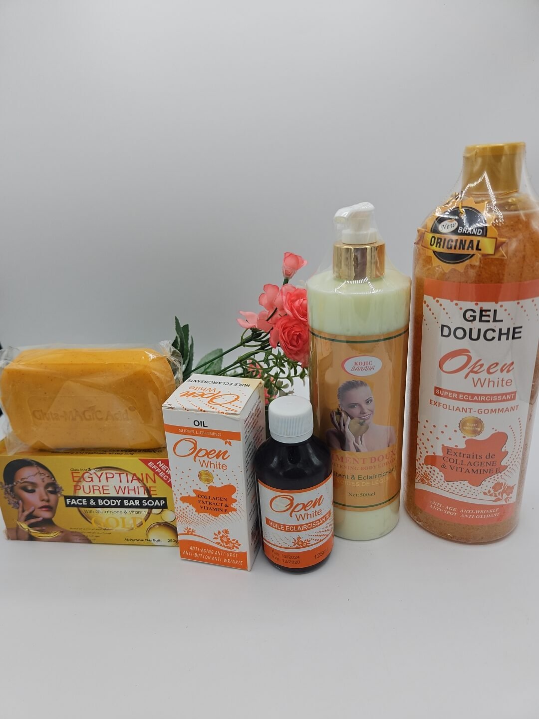 Gamme corporelle Open White gel douche 1litre, huile 125ml , lait corporelle PIMENT DOUX 500ml et savon Purec Egyptian Gold OR 250g